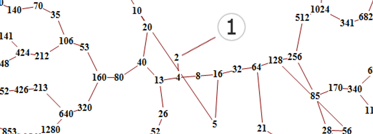 // a function that returns the// next number in the sequencepublic static long next(long n) { if (n % 2 == 0) return n / 2; // if n is even else return 3 * n + 1; // if n is odd}Next we need to calculate a given number's cycle length. We can either do it iteratively (which is probably faster) or we can do it recursively (which might cause stack overflow, but ends up being more elegant code). I'm going to go with the recursive implementation because of what we are going to do in the next section. $n=1$ will be our base case with a length of $1$, and our recursive case will be that the cycle length of the current number is one greater than the cycle length of the next number.